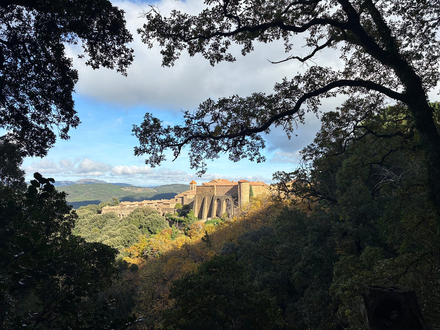 La Chartreuse de la Verne appeared through the late-afternoon haze like an apparition; a golden stone galleon hovering on the ridge. As I knelt to fill my bottles, a nun stepped out of the mist, her pale habit caught by the wind. She greeted me softly, in a lilting foreign accent. Many of the monastics these days are from elsewhere; the original French orders were suppressed during the Revolution, leaving only a few revived enclaves like this one. They now sell pomades, pottery, and trinkets to the brave souls who navigate the narrow road up.